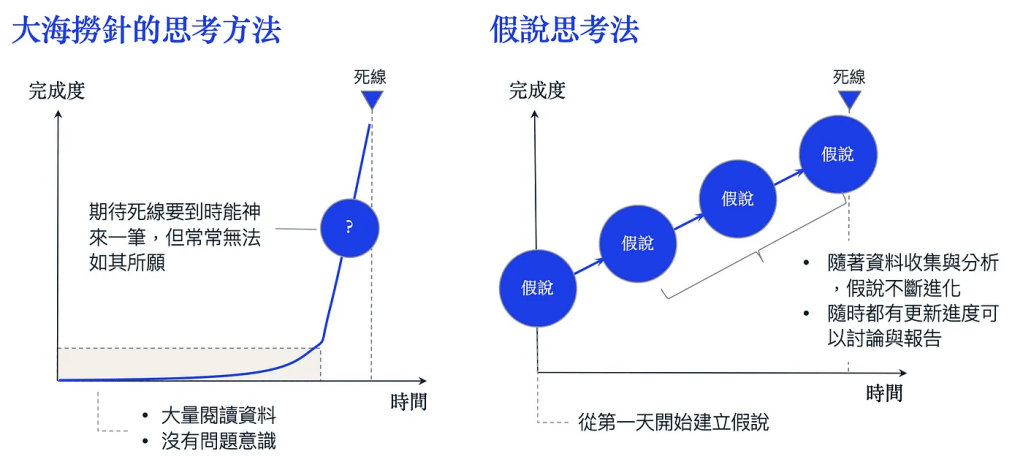 而相對於大海撈針式的思考,假說思考的不同之處在於,他使用了假說導向的問題解決方法,在有限的幾個小時中,腦力激盪出一些假說,雖然可能只有 20% 的正確率,但卻能幫助團隊在最短的時間內,找到切入的角度,並透過一次又一次的迭代,最終達成目標。